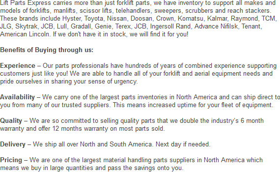 For your entire fleet of forklifts, we offer the best prices on all our parts. Phone today to get a quote on one of the attachments or parts we offer. Call us at: